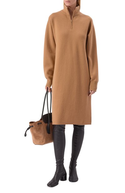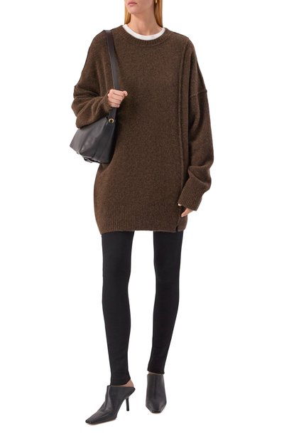 Облегающее мини-платье с объемными рукавами связали узором в рубчик из полушерстяной пряжи с добавлением кашемира и шелка. Изделие с рельефными швами, визуально моделирующими силуэт, дополнили молнией спереди и воротником-стойкой с кнопкой.