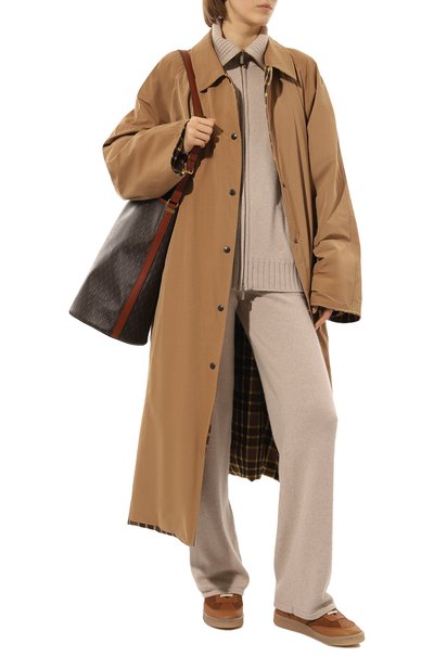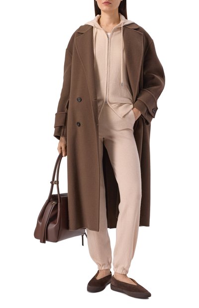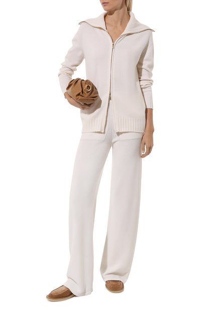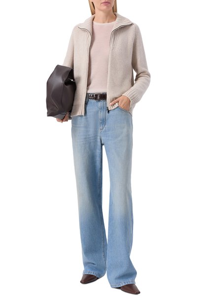 Кардиган с манжетами, поясом и высоким воротом в рубчик связали из кашемировой пряжи. Модель с карманами в боковых швах застегивается встречной молнией.