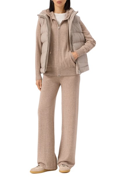 Кардиган с манжетами, поясом и высоким воротом в рубчик связали из кашемировой пряжи. Модель с карманами в боковых швах застегивается вс тречной молнией.