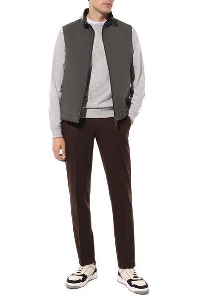 Для создания жилета, утепленного гусиным пухом, использовали микс полиамида и шелка. Модель с воротником-стойкой и боковыми карманами застегивается молнией, скрытой под штормовой планкой на потайных кнопках.