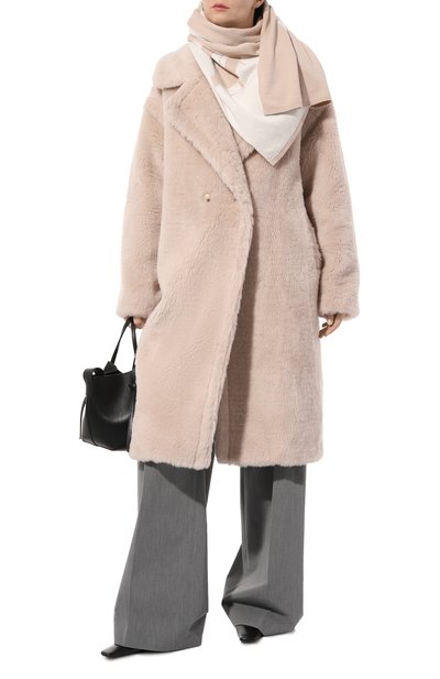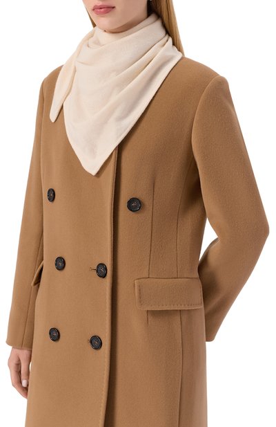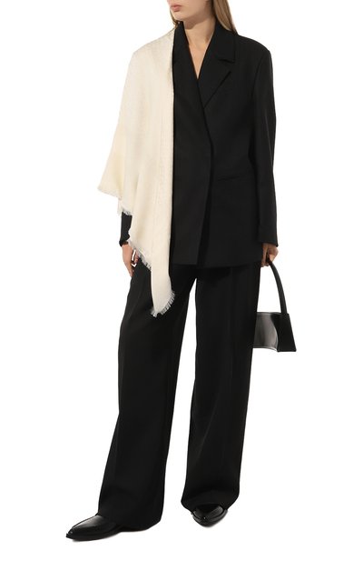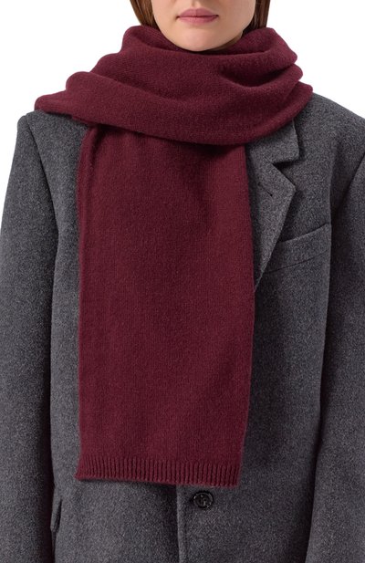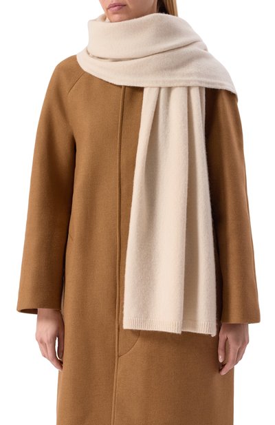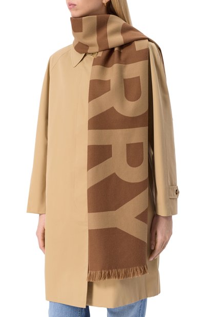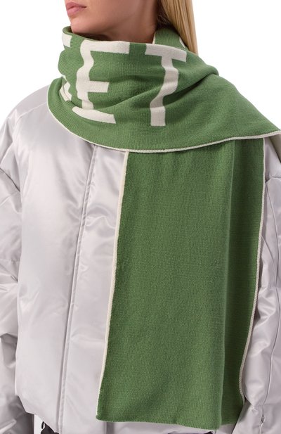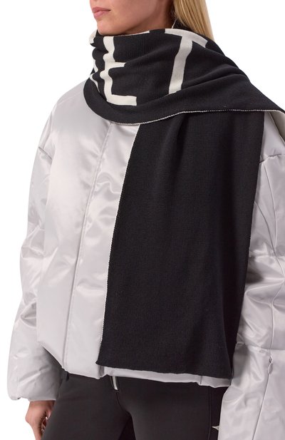 Двухцветный шарф связали из пряжи на основе мериносовой шерсти. На принадлежность аксессуара бренду указали крупным логотипом.