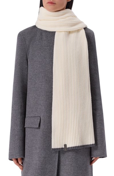 Двусторонний шарф с жаккардовым логотипом связали из шерстяной пряжи. Длины аксессуара хватит для пары оборотов вокруг шеи.