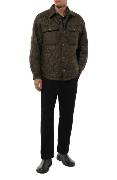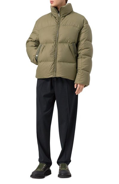 Стеганую куртку с регулируемым воротником-стойкой и двумя врезными карманами выполнили из матового нейлона. Рукав украсили нашивкой с логотипом марки. Утепленная модель застегивается молнией.