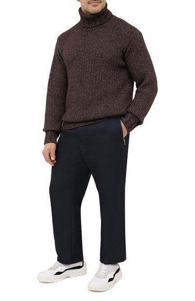 Широкие брюки с защипами на коленях выполнили из стрейчевой технической ткани на основе полиамида. Модель дополнили боковыми карманами, задним с молнией и крупным карго с клапаном.
