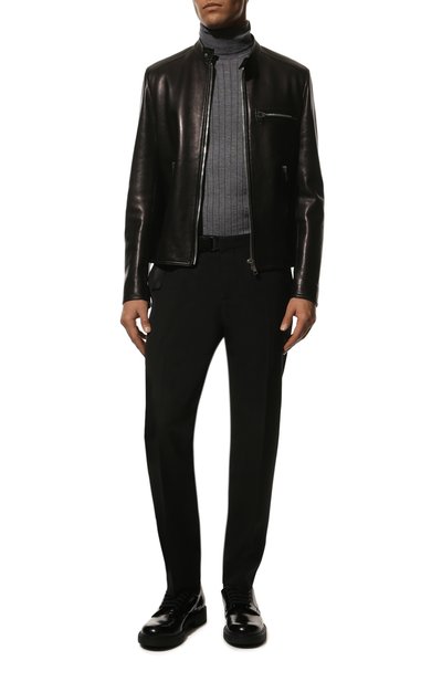 Для изготовления водолазки использовали шерстяную пряжу с добавлением кашемира и шелка. Поясу, манжетам и высокому вороту в рубчик вторит диагональный узор спереди.