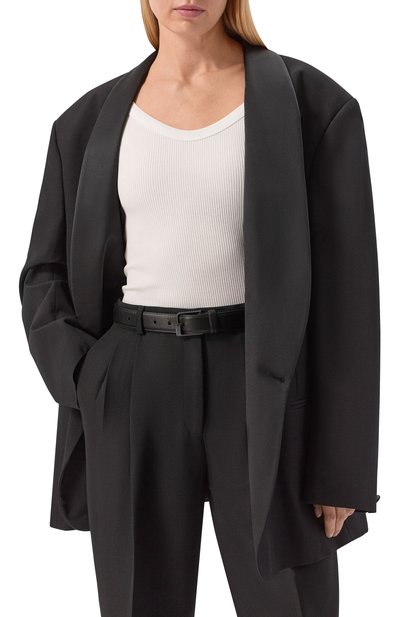 Ремень шириной 3,5 см выполнили из мелкозернистой наппы. Аксессуар с двумя фиксированными шлевками застегивается квадратной пряжкой.