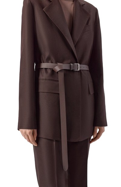 Ремень шириной 3,5 см выполнили из мелкозернистой наппы. Аксессуар с двумя фиксированными шлевками застегивается квадратной пряжкой.