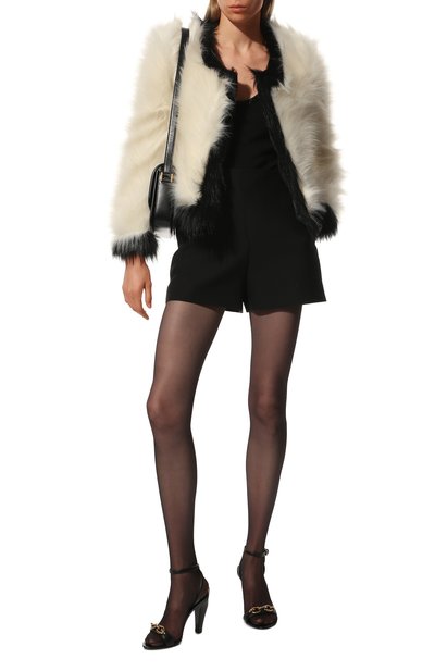 Жилет Emke с широким воротником выполнили из смесового шерстяного трикотажа, напоминающего длинноворсовую овчину. Модель с отделкой перьями на фестончатым кантом снизу завязывается длинными фирменными шнурами.