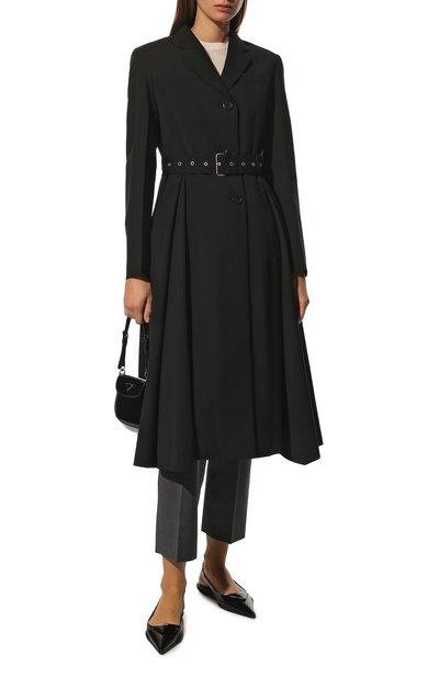 Пальто Melia с карманами по бокам дополнили корсетной шнуровкой сзади. Асимметричную модель с кожаными шалевым воротником, планками и манжетами выполнили из струящейся ткани на основе ацетата и вискозы.