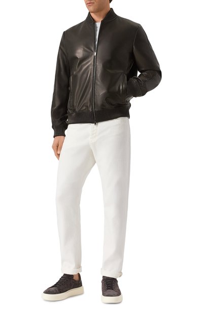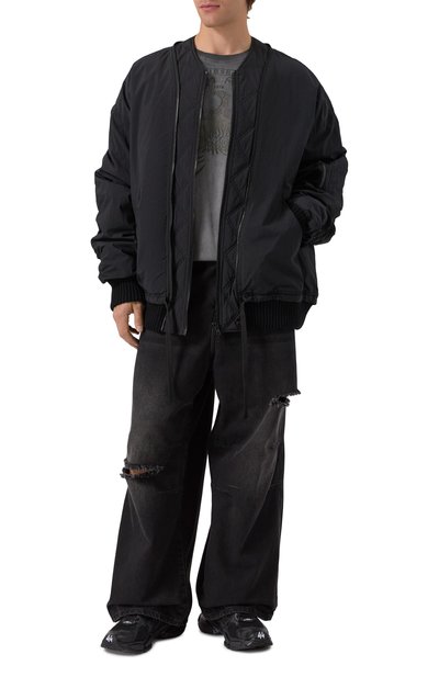 Бомбер на шелковом подкладе выполнили из полиамида. У модели со связанными резинкой поясом, манжетами и высоким воротом предусмотрели три кармана, один из которых сделали многосоставным и расположили на рукаве.