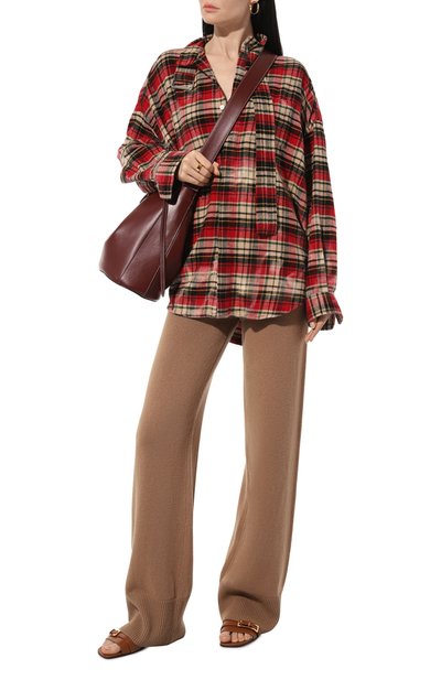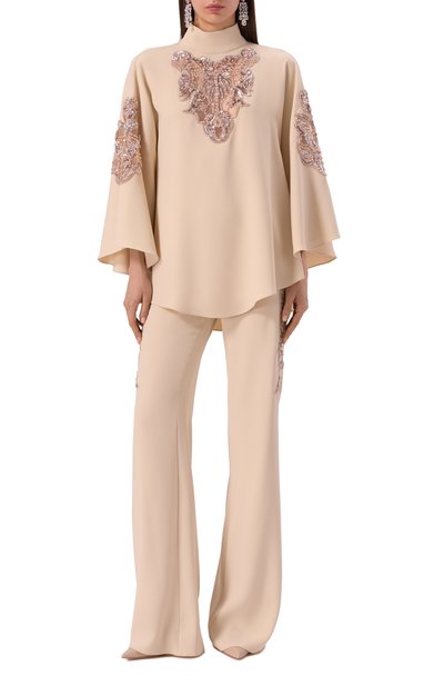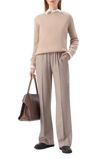 Брюки с боковыми карманами выполнили из кашемировой фланели с добавлением шерсти норки и шелка. Модель составит гармоничный дуэт с парным жакетом.