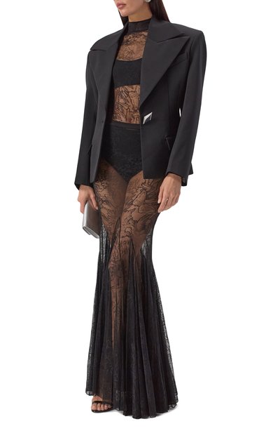 Боди Ziggy с высокими воротником-стойкой и длинными рукавами сшили из полупрозрачного кружева с цветочным мотивом. Эластичная модель с хлопковой ластовицей застегивается потайной молнией сзади.