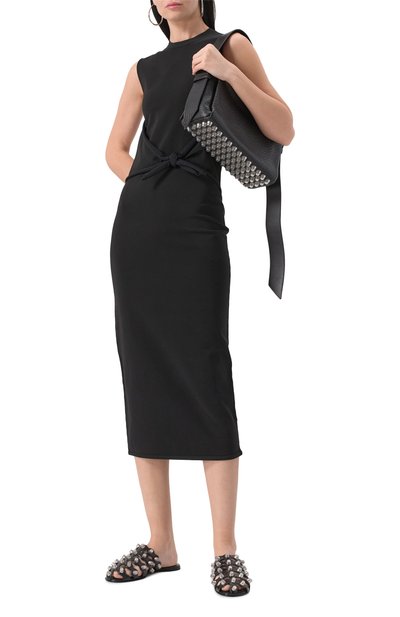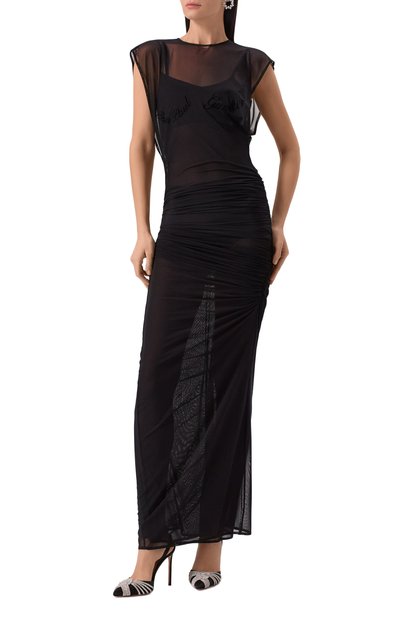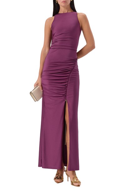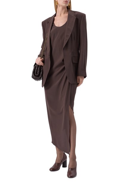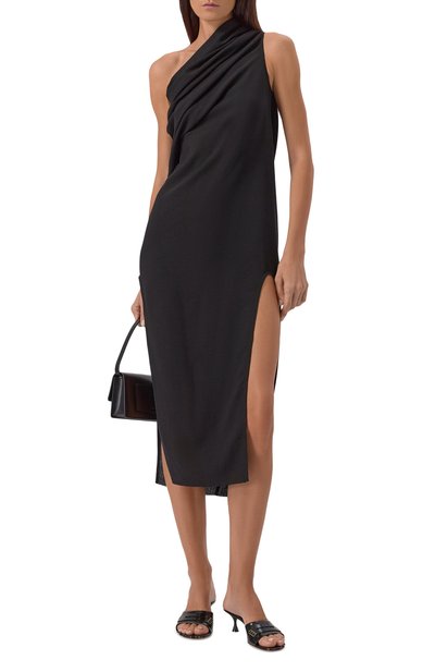 Асимметричное платье Austria с драпировкой и высоким разрезом выполнили из вискозного атласа, а подкладку изготовили из ацетата с добавлением полиэстера. Модель застегивается потайной молнией сбоку.