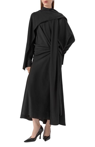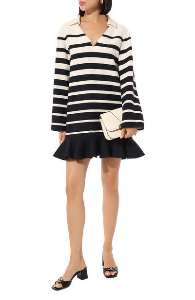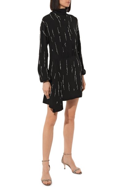 Мини-платье со спущенной линией плеч и высоким воротником-стойкой сшили из полушерстяного трикотажа в рубчик. Эластичную модель дополнили крупной серебристой булавкой, создающей драпировки спереди.