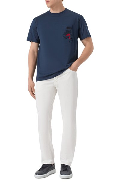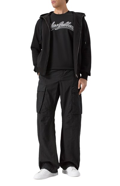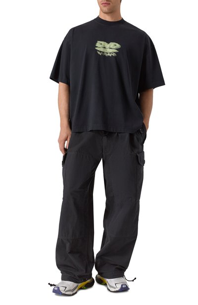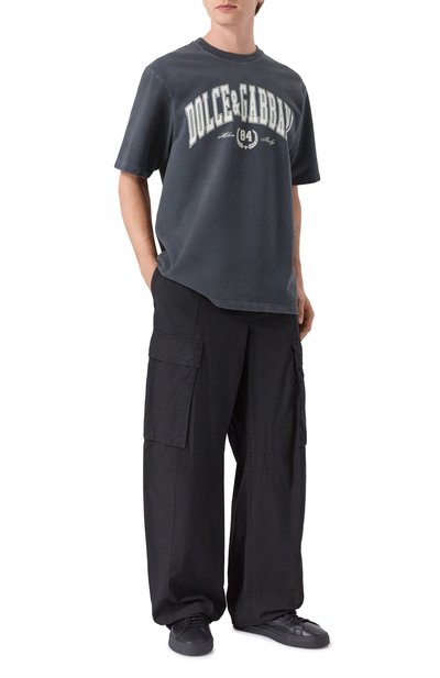 Декоративно состаренную футболку с потертостями выполнили из хлопкового джерси. Модель с круглой горловиной и спущенной линией плеч украсили контрастной вышивкой Luxury спереди.