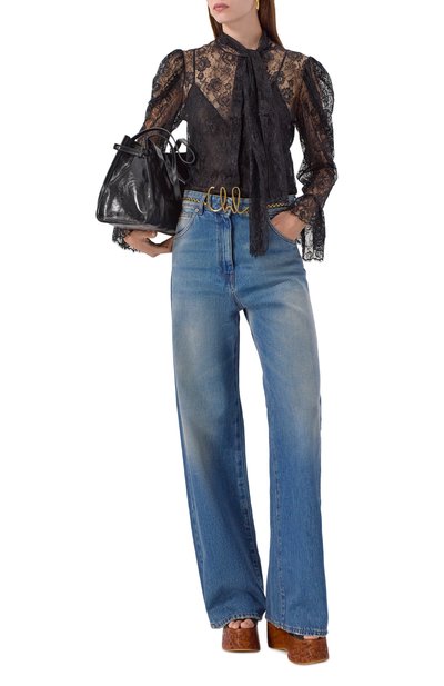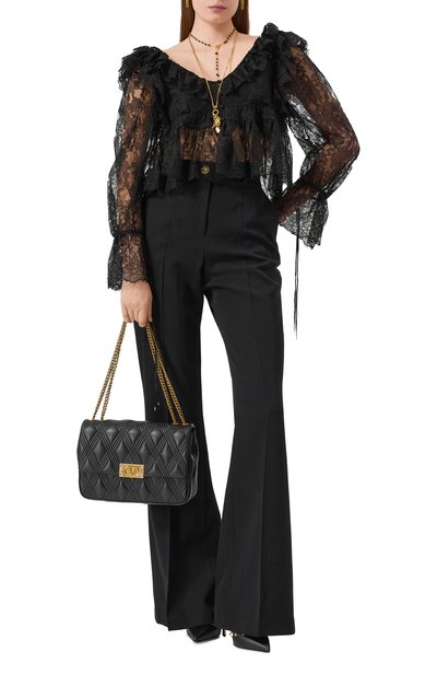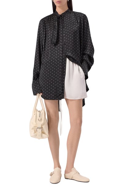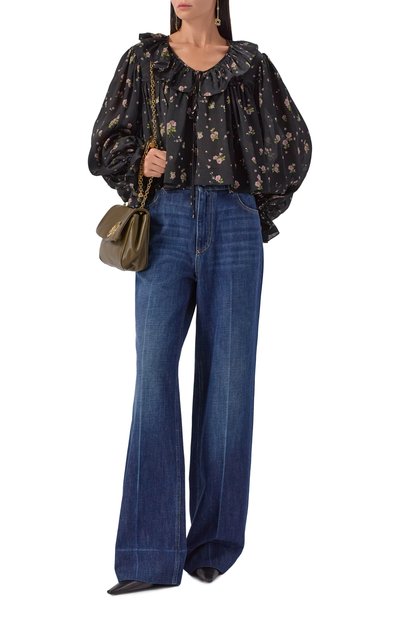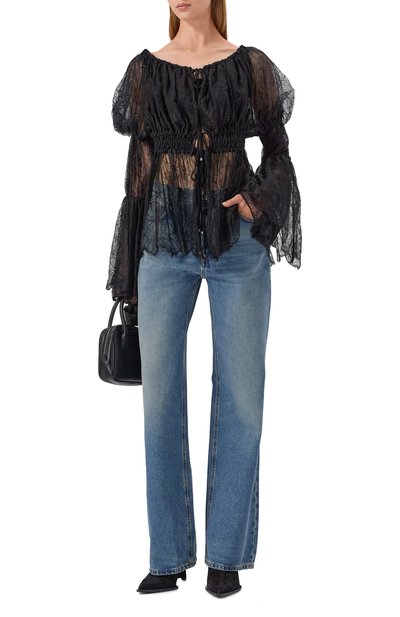 Плиссированную блузку с эластичными вставками на талии, рукавах и многоярусных манжетах выполнили из полупрозрачной шелковой органзы. Открытую линию плеч подчеркнули драпированной накладкой.