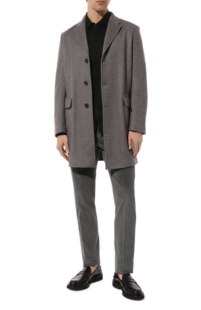 Пальто с отложным воротником, мягкой линией плеч и супатной застежкой дополнили боковыми карманами. Модель на атласном подкладе выполнили из кашемировой ткани с добавлением шелка.