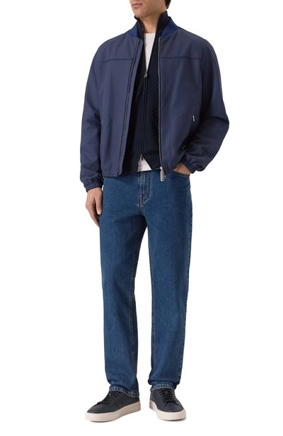 Бомбер с манжетами, поясом и воротником-стойкой из трикотажа в рубчик выполнили из кашемировой ткани. Куртку со спущенной линией плеч, боковыми карманами и встречной молнией декорировали брендированной накладкой на спинке.