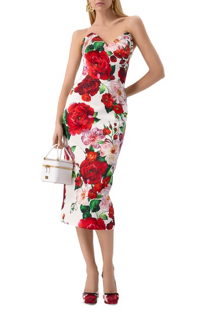 Драпированное мини-платье с цветочным мотивом выполнили из джерси на основе купро. Модель с асимметричной накладкой на подоле, подчеркивающей силуэт «песочные часы», дополнили скрытой резинкой на лифе.