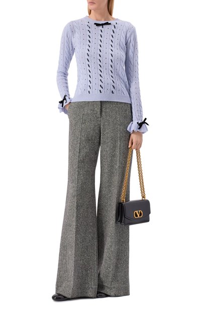Для пошива широких меланжевых брюк с четырьмя карманами использовали шерсть с добавлением нейлона, а подкладку выполнили из шелка. Задние шлевки на поясе закрепили в форме литеры M.