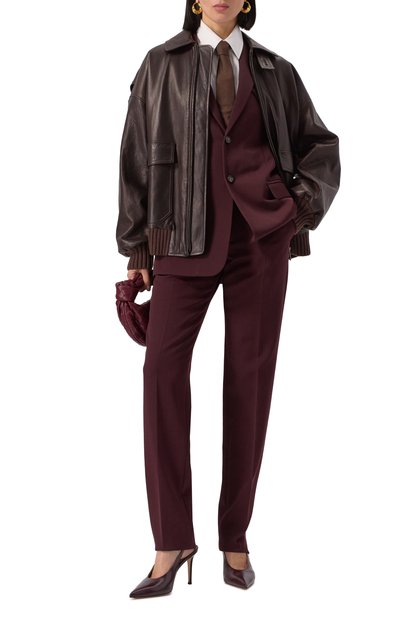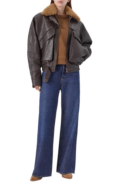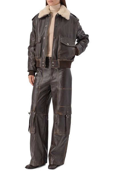 Бомбер с воротом, поясом и манжетами из трикотажа в рубчик изготовили из полиэстера с добавлением хлопка. Oversize-модель с боковыми и нарукавным карманами застегивается молнией с потайной штормовой планкой.