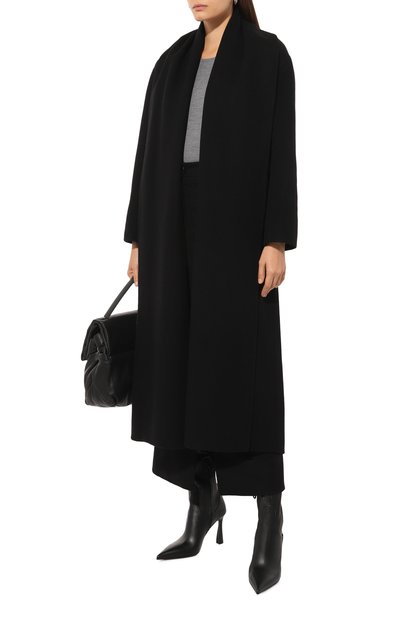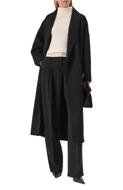 Пальто с широкими лацканами и боковыми карманами выполнили из шерсти первого пострига с добавлением кашемира. Модель с глубокой встречной складкой на подоле сзади дополнили съемными патами на рукавах и поясом, регулирующим запах.