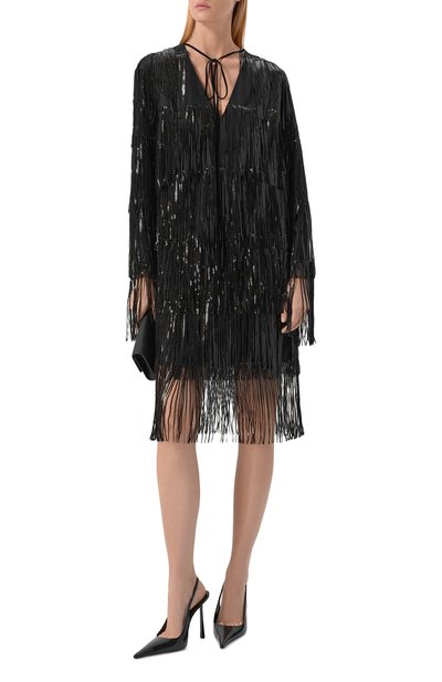 Макси-платье из тюля в горох отделали длинной бахромой из пайеток. Каплевидный вырез на груди подчеркнули бархатным бантом. Модель с высокой шлицей дополнили подкладом из купро.
