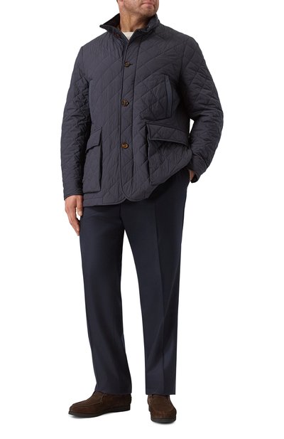 Утепленную стеганую куртку с подкладкой из хлопкового твила в фирменную клетку Burberry Check сшили из влагоотталкивающего нейлона. Отделку манжет, отложного воротника и боковых карманов выполнили из вельвета. Модель застегивается молнией и штормовой кнопочной планкой.
