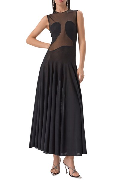 Для пошива миди-платья с молнией на спинке использовали чуть эластичный креп из шерсти первого пострига. Отложной воротник, низ и высокий боковой разрез модели украсили металлическими бусинами.