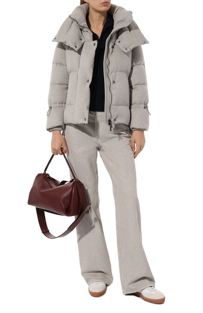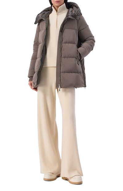 Стеганую куртку на пуху выполнили из нейлона. Модель с регулируемым капюшоном и боковыми карманами застегивается молнией, скрытой под штормовой планкой с кнопками. Принадлежность пуховика марке обозначили брендированной нашивкой снизу.