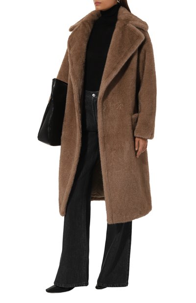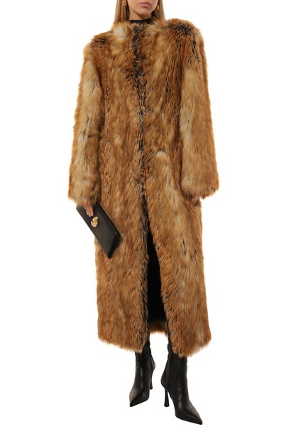 Свободную шубу, застегивающуюся молнией и кнопкой, выполнили из искусственного меха с длинным ворсом. Низ модели с воротником-стойкой и карманами по бокам регулируется эластичным шнурком с фиксаторами.