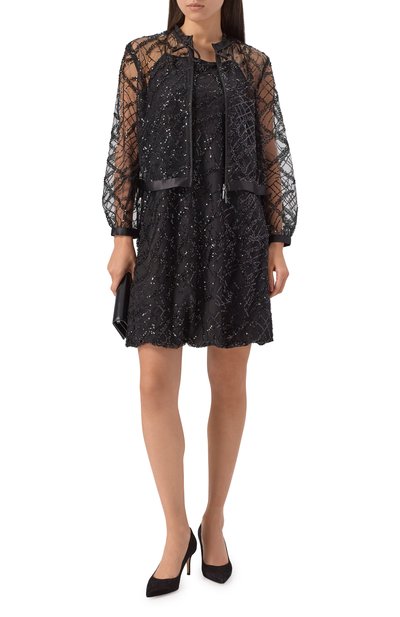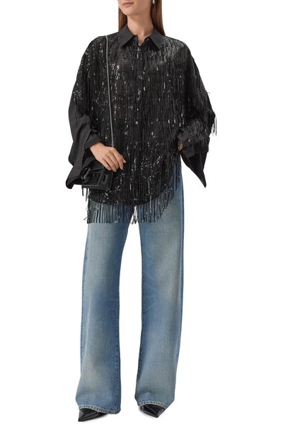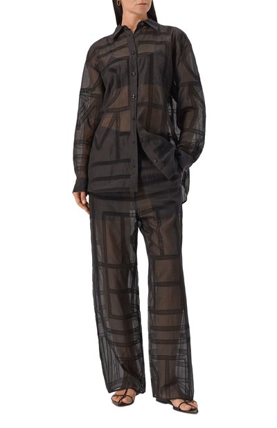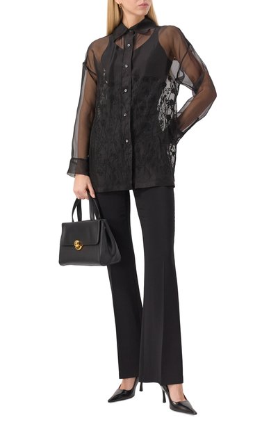 Приталенную блузку с рукавами реглан и отложным воротником выполнили из эластичного кружева с цветочным мотивом. Сама модель, как и высокие манжеты, застегивается потайной молнией.
