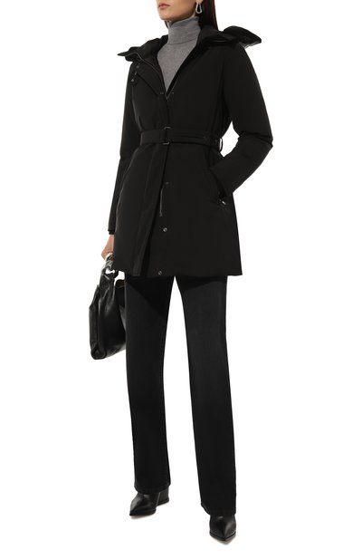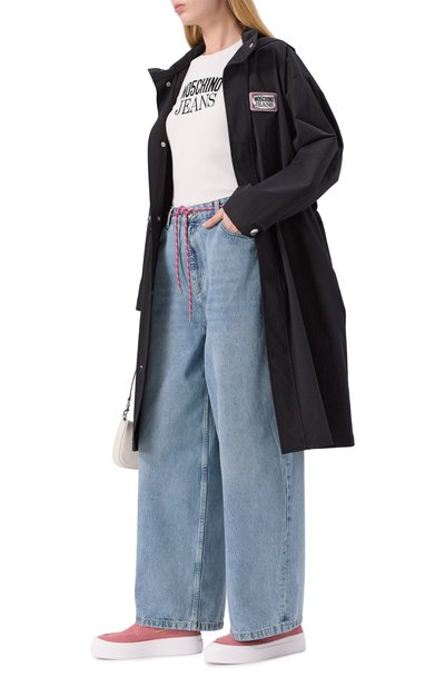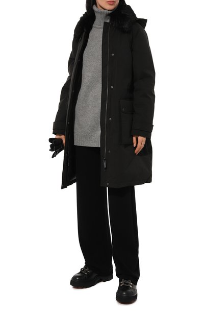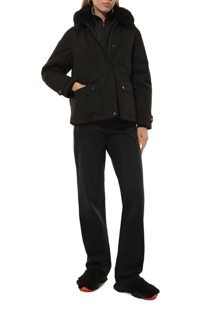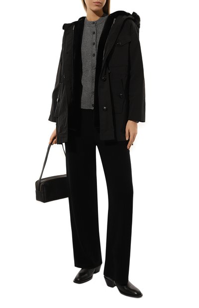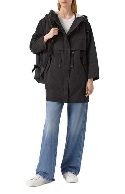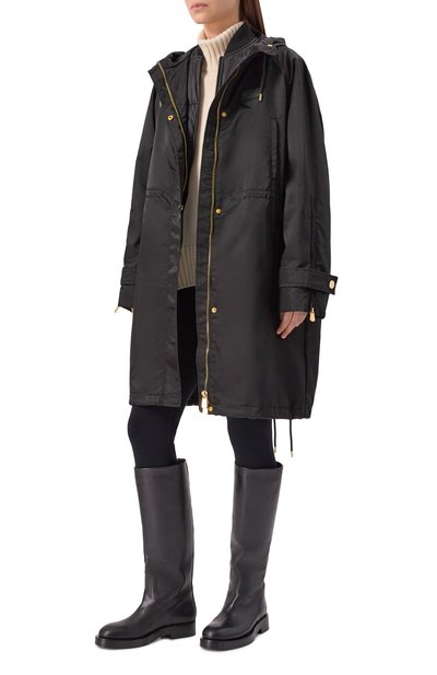 Утепленную парку с контрастной окантовкой сшили из матового полиэстера. Боковые разрезы и два из четырех карманов застегиваются молниями, а паты на рукавах – кнопками. Куртку свободного кроя дополнили регулируемым капюшоном и поясом-кулиской.