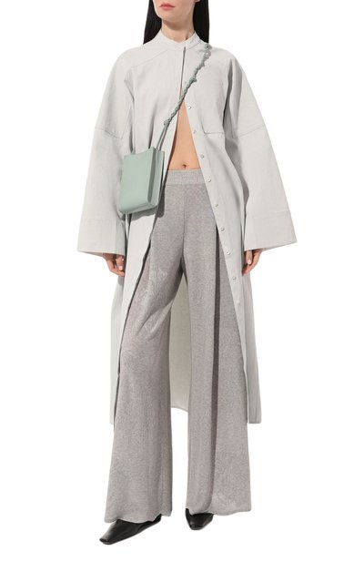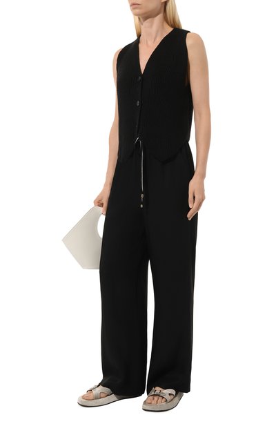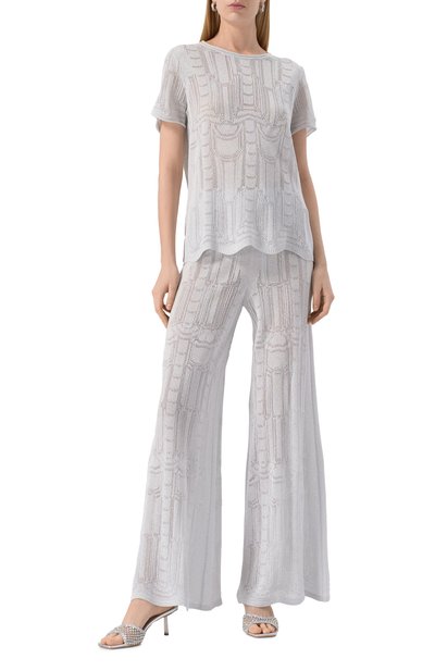 Брюки со средней посадкой и двумя боковыми карманами выполнили из эластичного микса полиамида и хлопка. Полупрозрачную модель на укороченном подкладе дополнили брендированным поясом.
