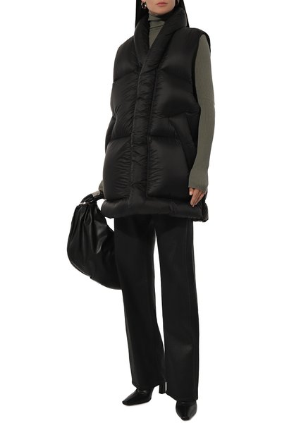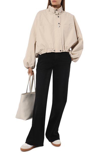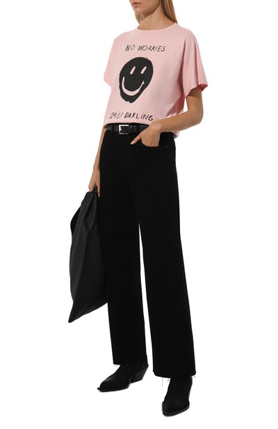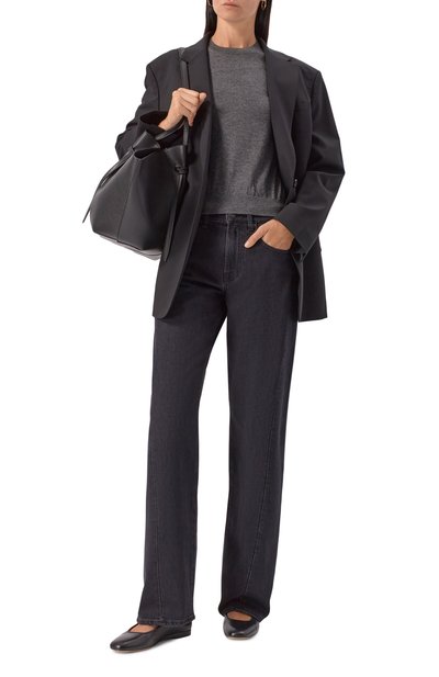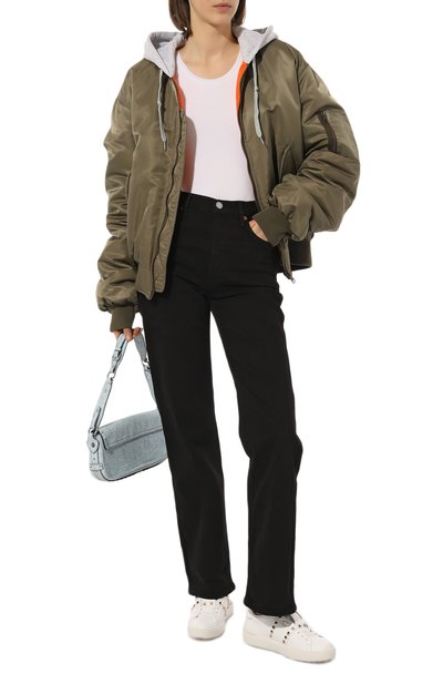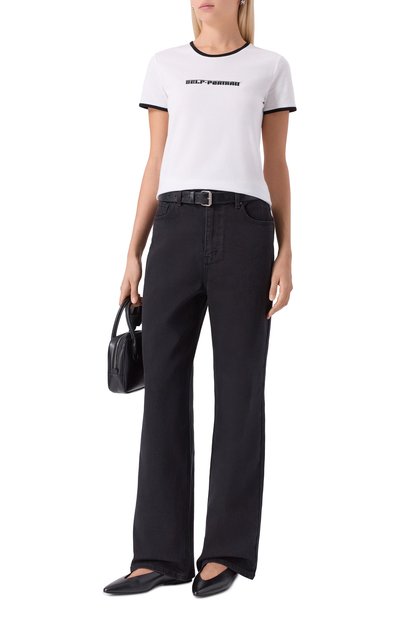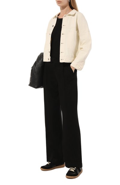 Широкие джинсы из неэластичного хлопкового денима отделали вуалью из полупрозрачного тюля. Модель с пятью карманами дополнили кожаным брендированным патчем на поясе сзади.