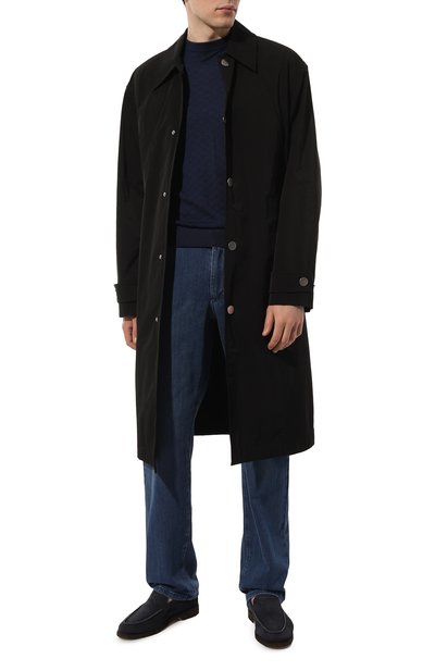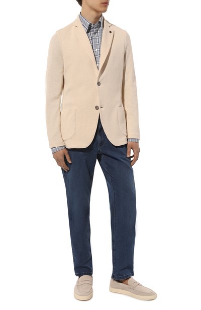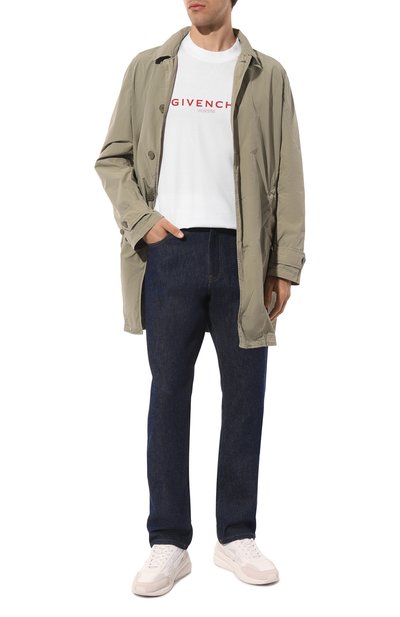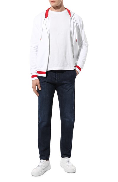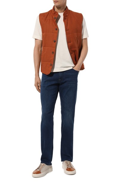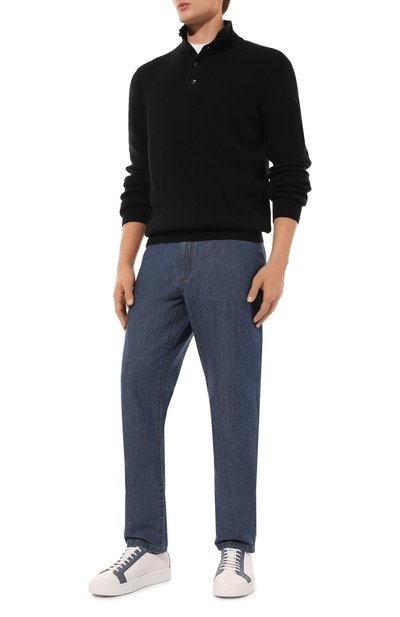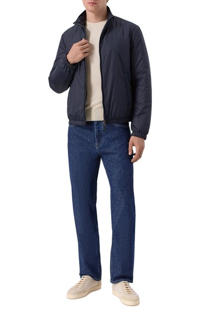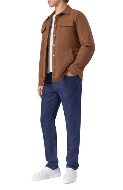 Джинсы из японского денима на основе хлопка, смешанного с шелком, гармонично впишутся в базовый гардероб. Модель прямого кроя дополнена четырьмя карманами: врезными боковыми и задними с клапанами на пуговицах.