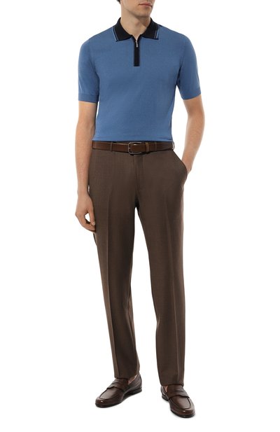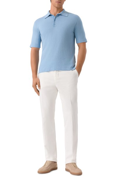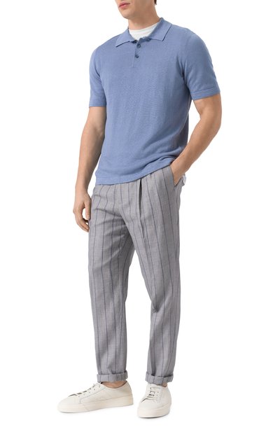 Поло с манжетами и поясом в рубчик связали из шерсти мериноса диаметром 13,5 микрон. Модель застегивается четырьмя перламутровыми пуговицами.