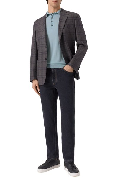 Поло с манжетами и поясом в рубчик связали из шерсти мериноса диаметром 13,5 микрон. Модель застегивается четырьмя перламутровыми пуговицами.