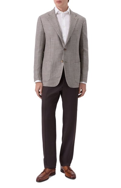 Дерби с круглым мысом сшили из комбинации гладкой и зернистой телячьей кожи. Туфли с перфорированными узорами, как у брогов, установили на массивную протекторную подошву.