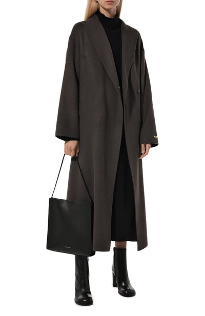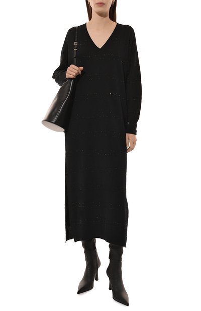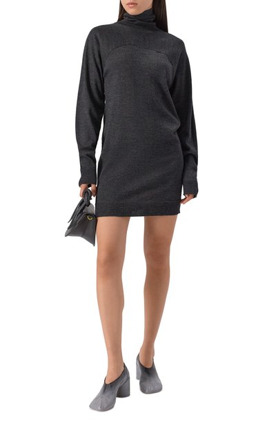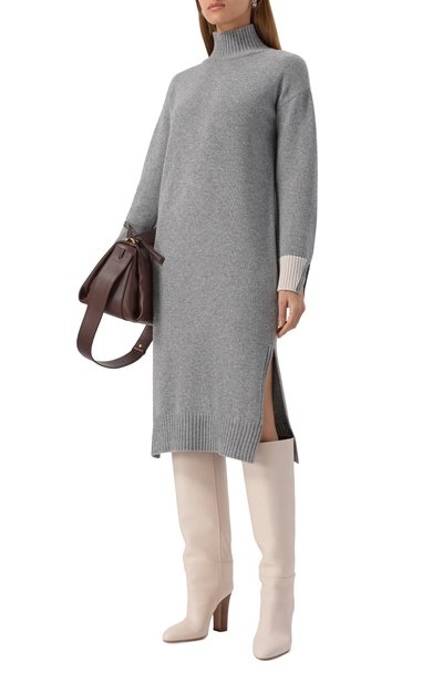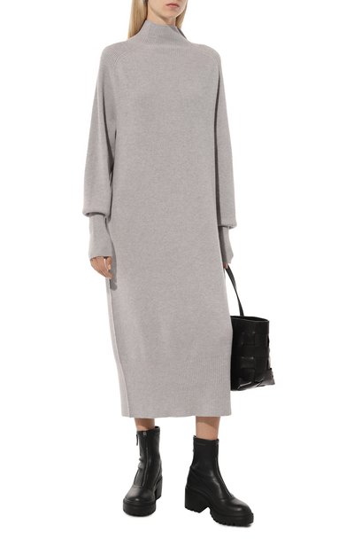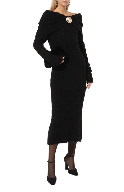 Миди-платье выполнили из козьего мохера, связав более плотно высокий воротник и манжеты длинных рукавов. Спереди модель декорировали входящей в комплект брошью-цветком.