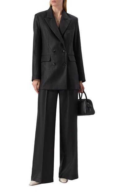 Широкие брюки со стрелками выполнили из вискозного трикотажа с добавлением полиэстера и полиамида. Сбоку модель с эластичным поясом в рубчик украсили вышитым логотипом марки.