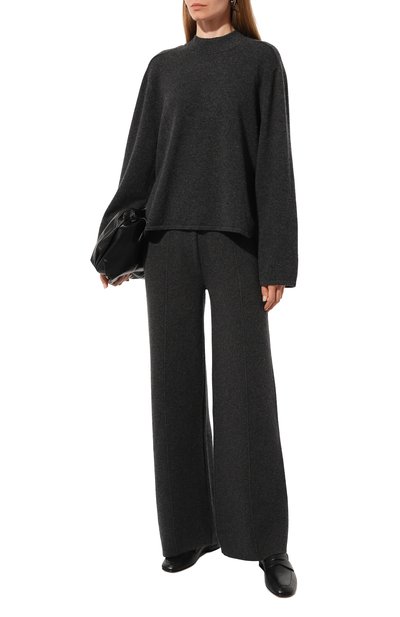 Широкие брюки со стрелками выполнили из вискозного трикотажа с добавлением полиэстера и полиамида. Сбоку модель с эластичным поясом в рубчик украсили вышитым логотипом марки.