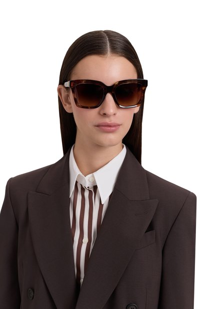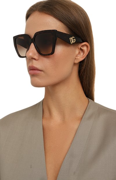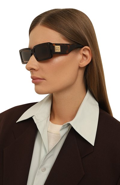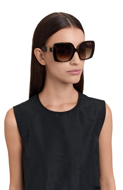 Квадратные солнцезащитные очки с блокирующими ультрафиолет линзами изготовили из ацетата. Дужки с логотипами закрепили с помощью шарниров в виде монограммы DG.