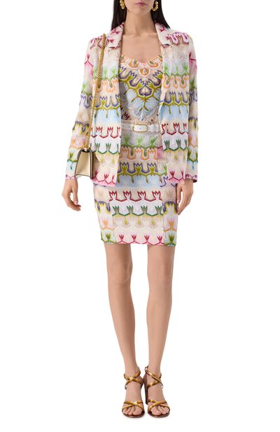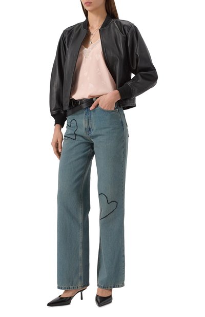 Топ с узкими бретелями и отделкой из французского кружева выполнили из шелкового крепдешина с изображением лошадей. Принадлежность модели с V-образным вырезом марке обозначили фирменными вышитыми крыльями сзади.