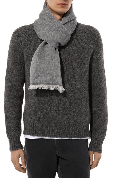 Широкий шарф с шевронным узором изготовили из шерсти с добавлением кашемира. Длины аксессуара с бахромой хватит, чтобы завязать объемный узел.