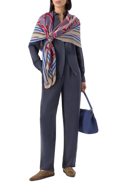 Для создания рубашки свободного кроя использовали меланжевую хлопковую фланель. Воротник и передние полочки модели украсили узорами, вышитыми полушерстяной нитью в тон.