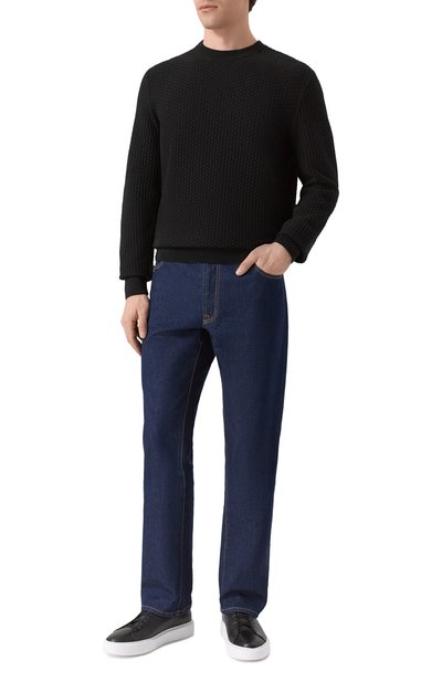 Джемпер с отделкой в рубчик связали из чистой шерсти. Модель застегивается скрытой под планкой молнией и пуговицей на высоком вороте.
