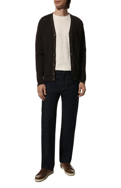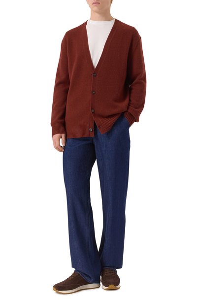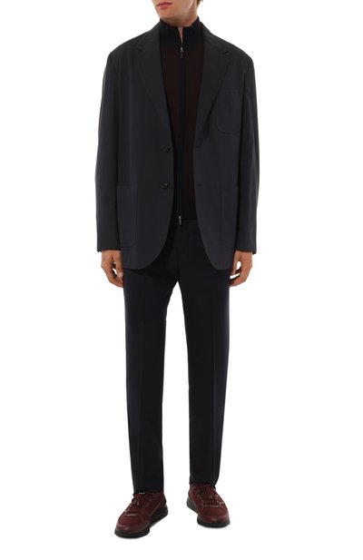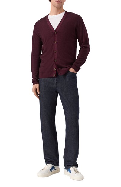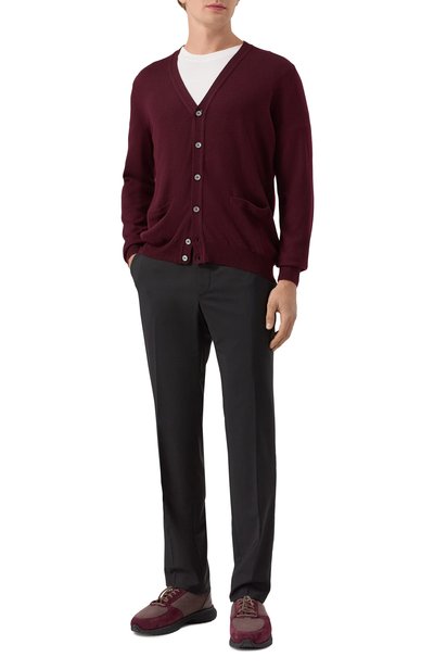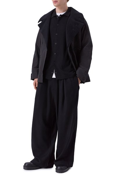 Для изготовления кардигана использовали трикотаж из шерсти первого пострига. Высокий воротник, пуговичную планку, манжеты и пояс модели выполнили в рубчик.