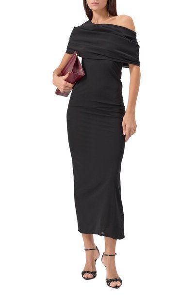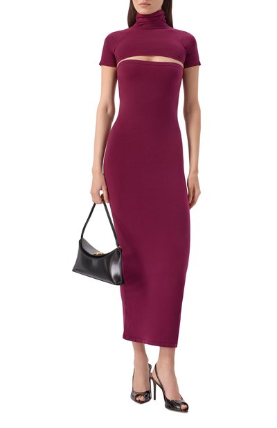 Разрез вдоль линии декольте делит облегающее платье на две части, каждое из которых можно носить отдельно. Модель с высоким воротом и рукавами реглан изготовили из эластичного нейлонового трикотажа.