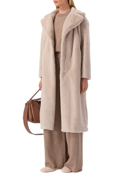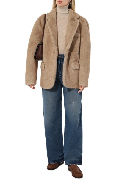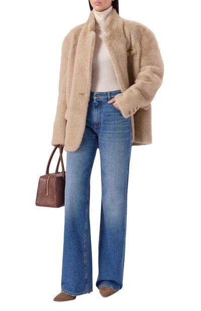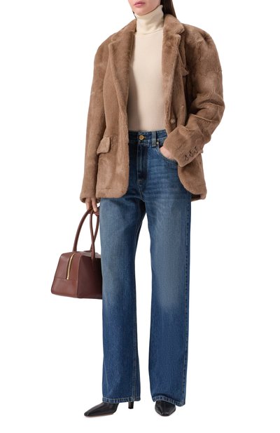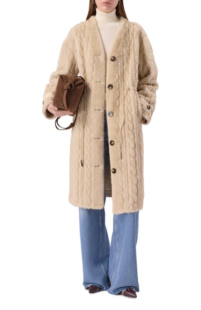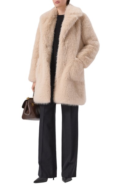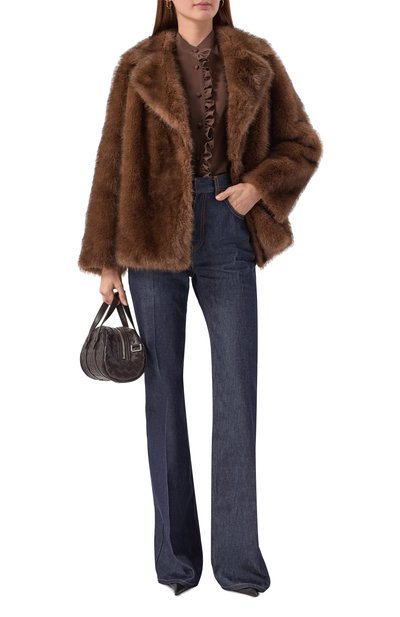 Короткую шубу с застежкой на роговые пуговицы выполнили из искусственного меха. Модель с широкими лацканами дополнили врезными боковыми карманами.